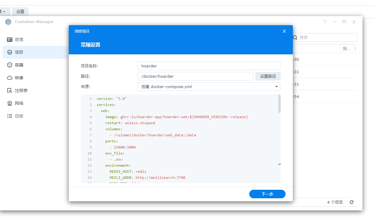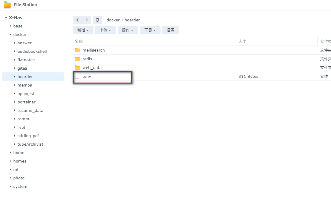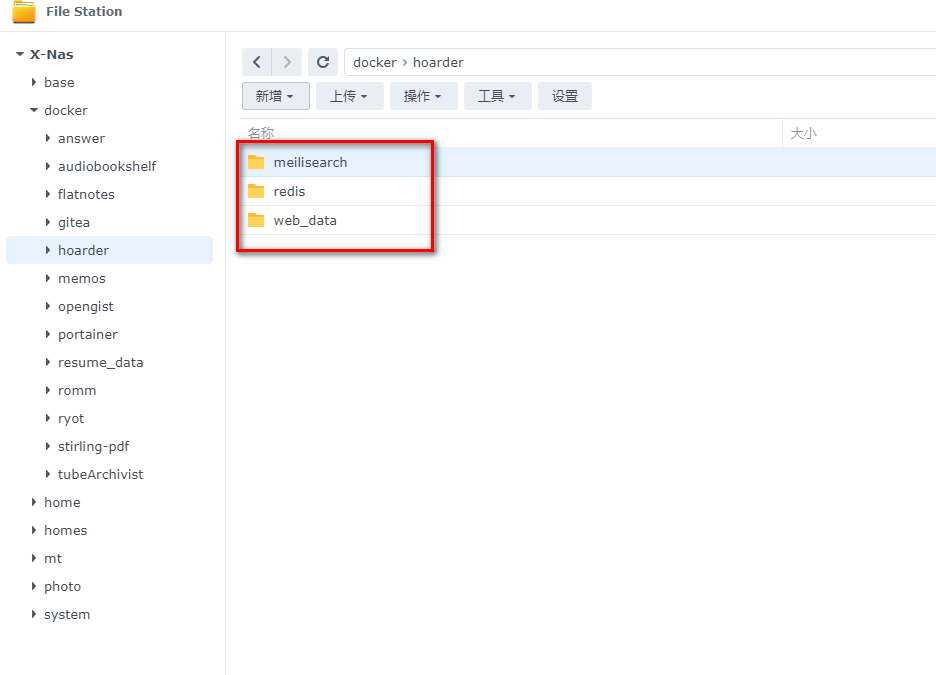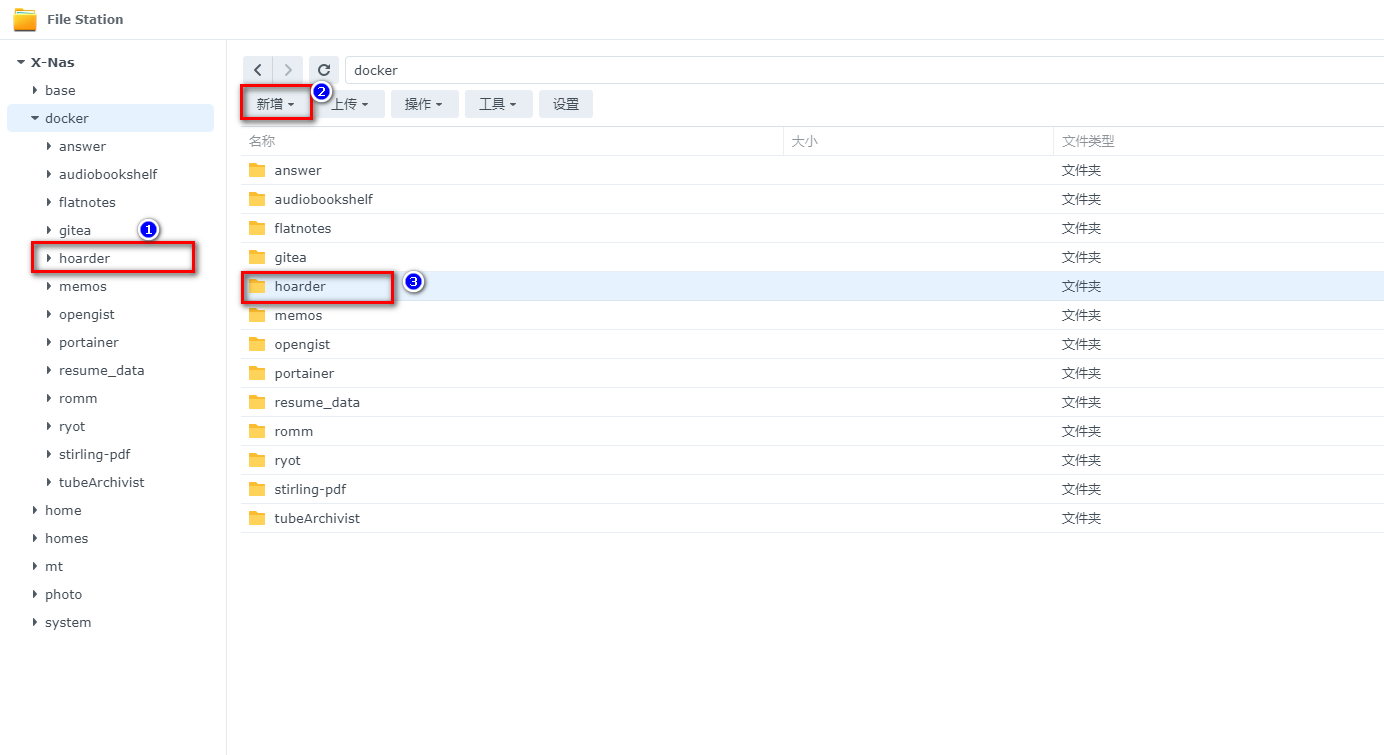 File Station 打开docker 文件夹,创建hoarder文件夹