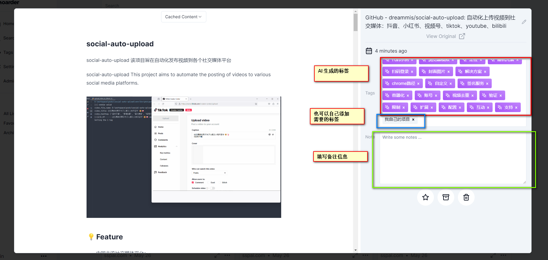 ai根据文章内容做出的分类标签,也可以自行添加自定义的标签,以及备注信息
