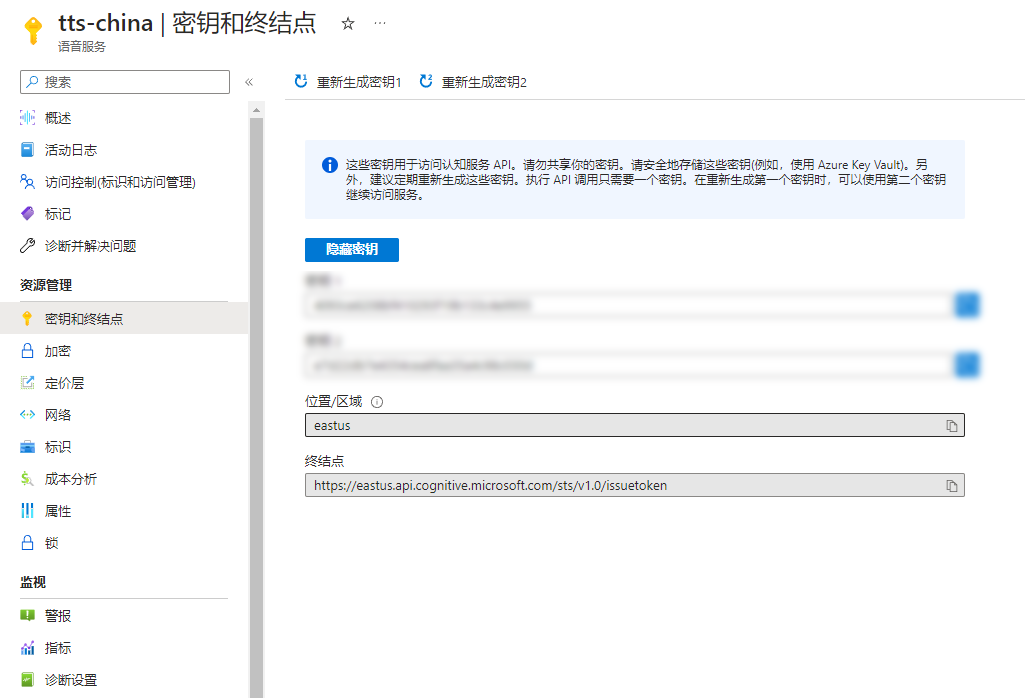密钥例如:“323e6131234102934f19b133c4e9955”位置与区域例如:eastus