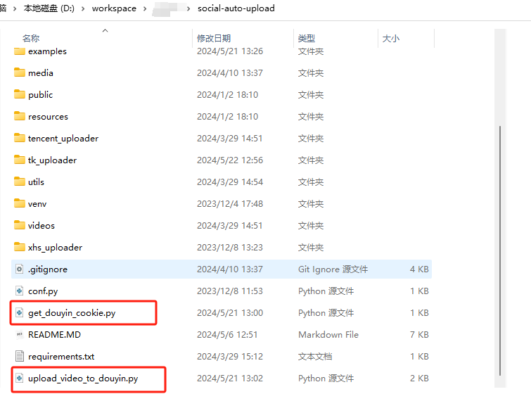 examples目录中的get_douyin_cookie.py、upload_video_to_douyin.py,拷贝到当前根目录(如果你会设置环境变量的话,那么你可以不拷贝)