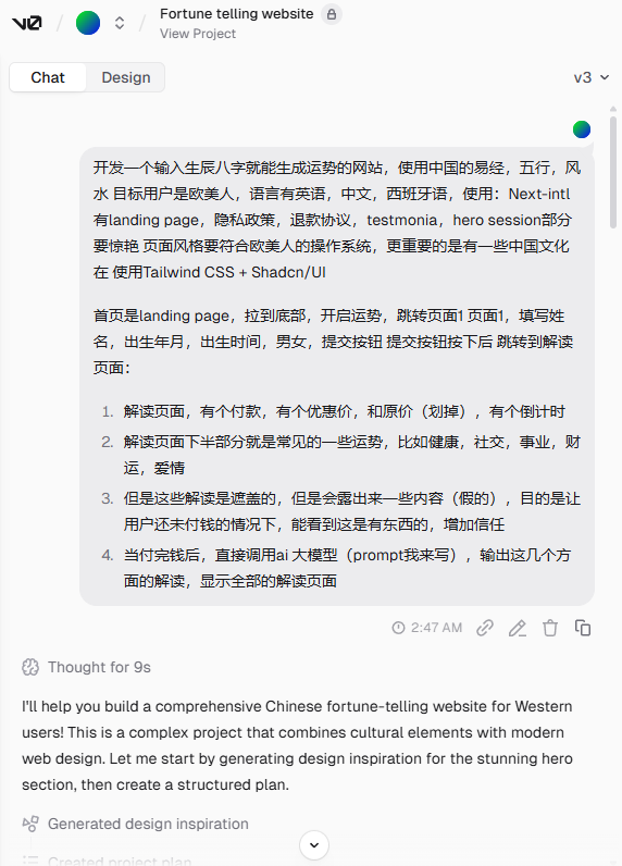 完成度蛮高了,ui部分大概2次对话,我自己感觉能有60%的完成度了,基本上可以用v0来完成前端,ui部分的开发